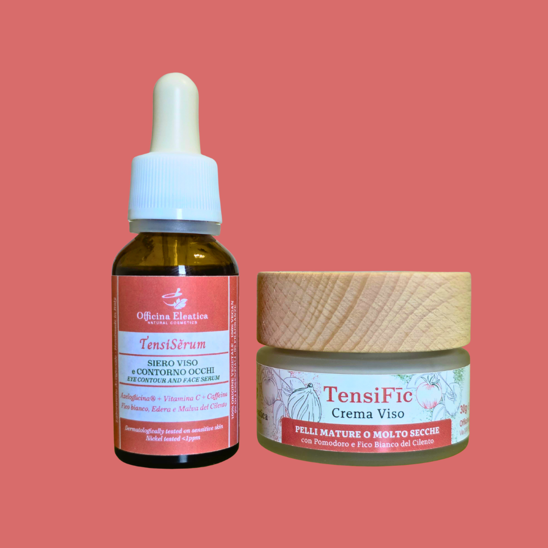 - tensiSerum – Siero viso e contorno occhi – idratante, tonificante,antiossidante che contrasta rughe e macchie cutanee, borse e occhiaie;